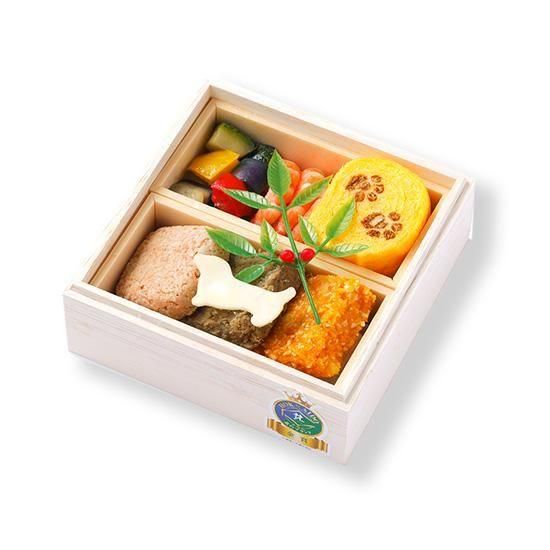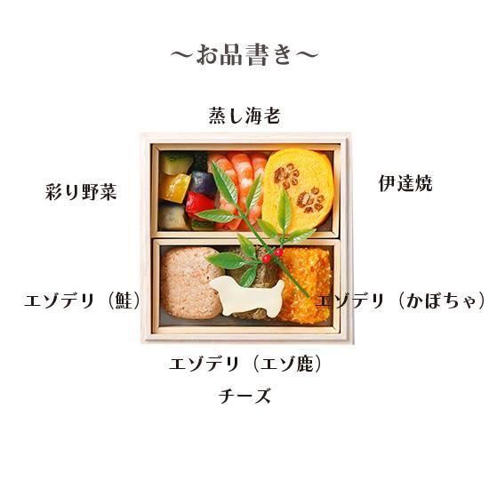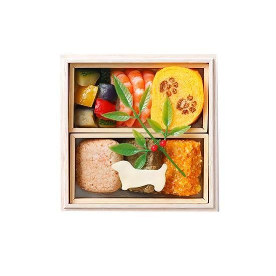 肉球柄の伊達焼やわんちゃん型のチーズが可愛らしい洋風おせちです。北海道産のエゾ鹿・鮭・かぼちゃなど、わんちゃんが喜ぶ素材を詰め合わせました!